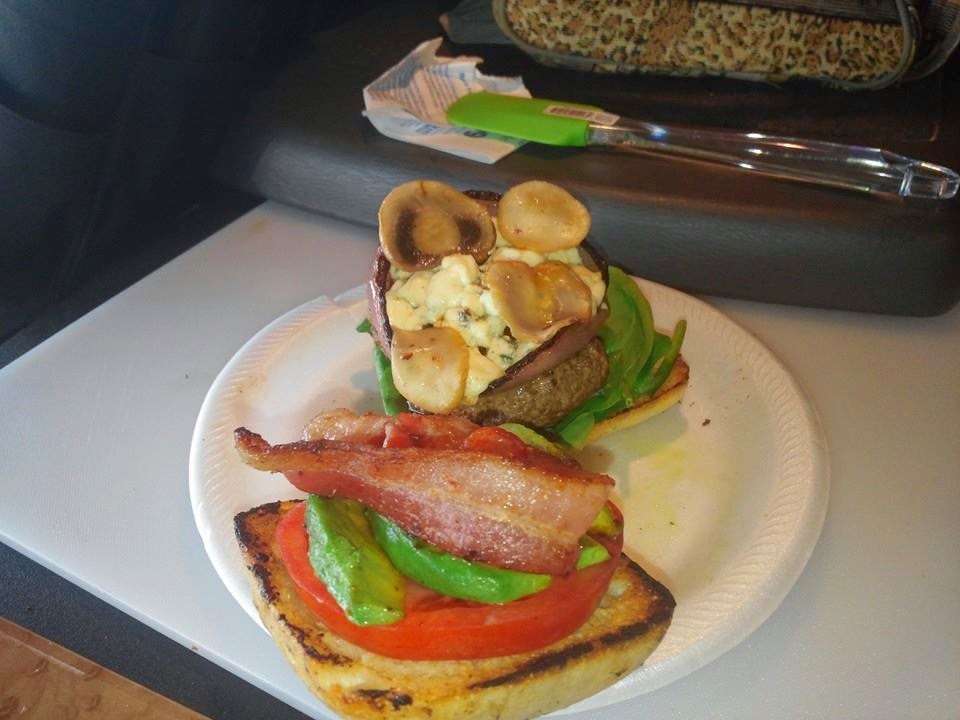 Cook burger to your likeing idea is to sear both sides ( hence black ) after its almost cooked thru on 2nd side place the raw red onion on burger and fill the onion with bleu cheese ( this keeps your cheese in place ) also adds alittle crunch to the meal . While thats melting remove mushroom and avacado and place the sliced chiabata in grill an toast. When tou toast bun top n bottom place on a plate put spinach on bottom of bun ( so juices dont make bun soggy ) then burger then begin to layer all other ingredient to your likeing. Hope you enjoy.